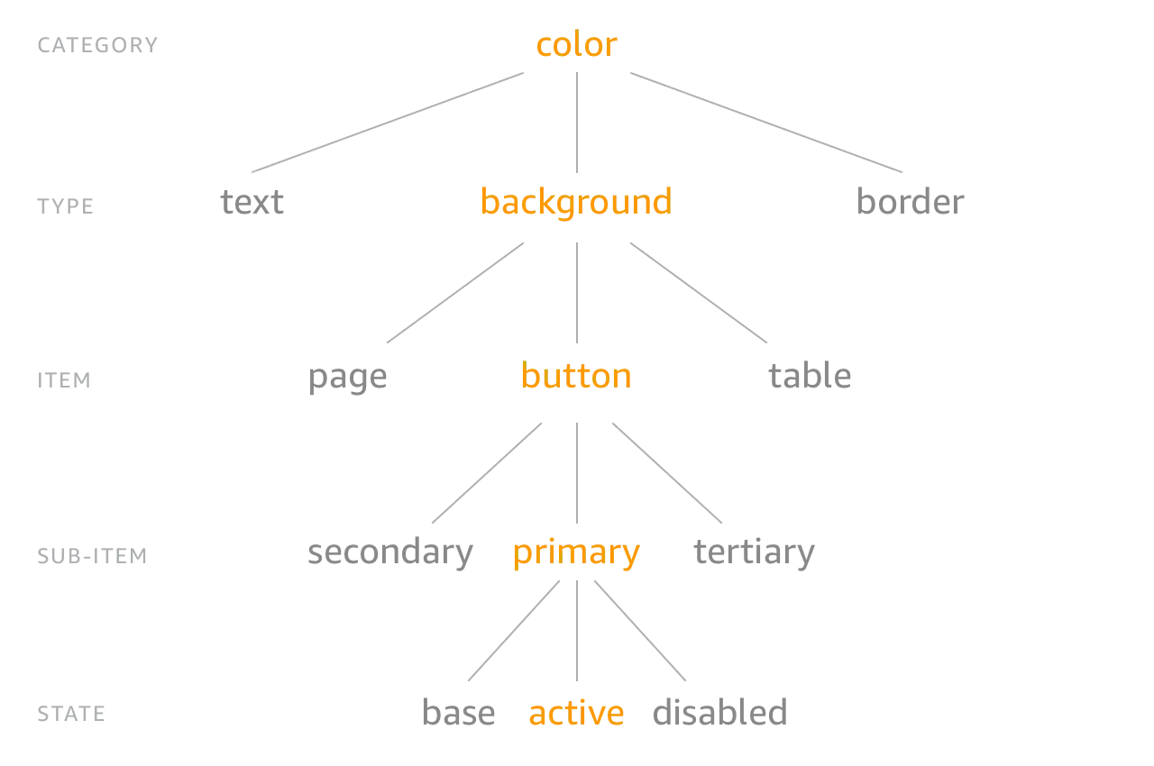 Design tokens are organized into a hierarchical tree structure with ‘category’ defining the primitive nature of the design token. For example, we have the color category and every design token underneath is always a color. As you proceed down the tree, you get more specific about what that color is. Is it a background color, a text color, or a border color? What kind of text color is it? You get the point. It’s like the animal kingdom classification: